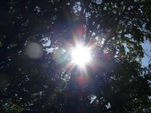 Sun filters through green canopy.