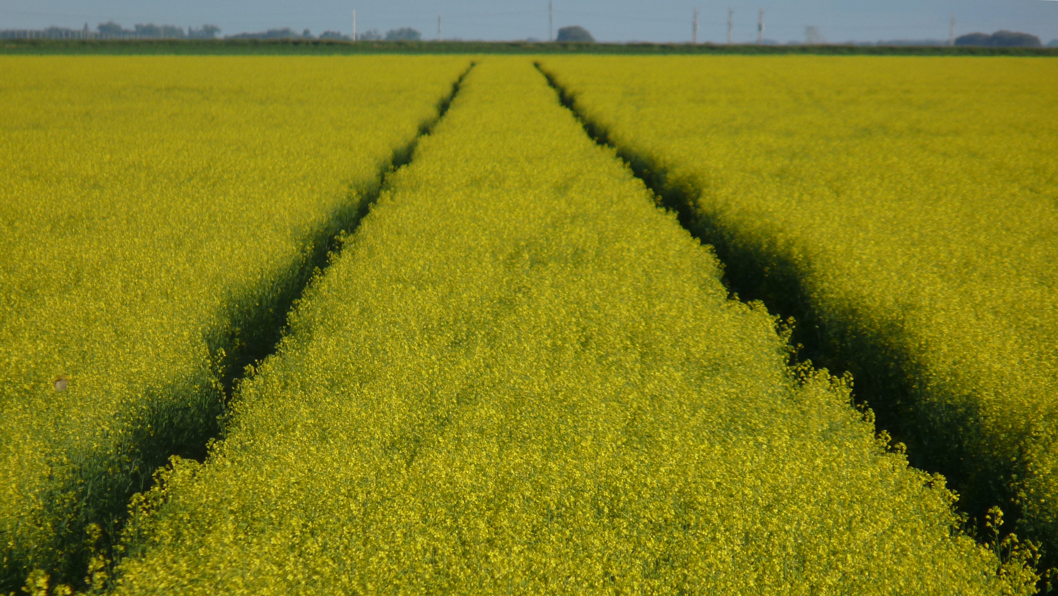 Sclerotinia stem rot is one of the most destructive diseases of canola. Plants are infected when the canola is in bloom so at this time fungicide is applied by either ground or air to protect the crop. It is especially important to do so in wet years like this when disease pressure is high. This photo shows the tracks a high-clearance sprayer left behind.