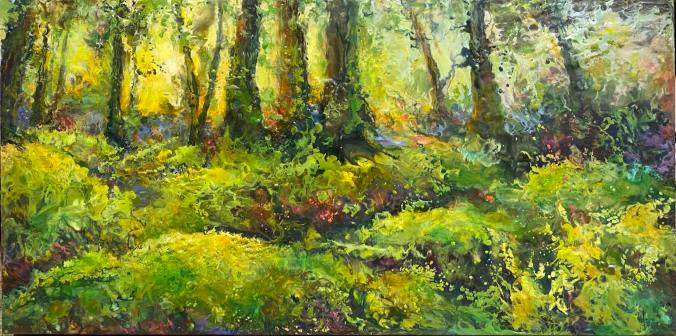 From Kathy’s artist statement: “There is nothing like breathing in forest air – its intoxicating mix of moss, earth, decay, cedar and pine. A forest’s lush array of colours and textures weave a visual feast. There is mystery, there is darkness, and oh there is light. It is the sensual, mysterious and dreamy nature of encaustic that allows me to tell this story best. I also consider Sandi Knight’s touching poetry/prose piece to be the perfect extension of my painting.”